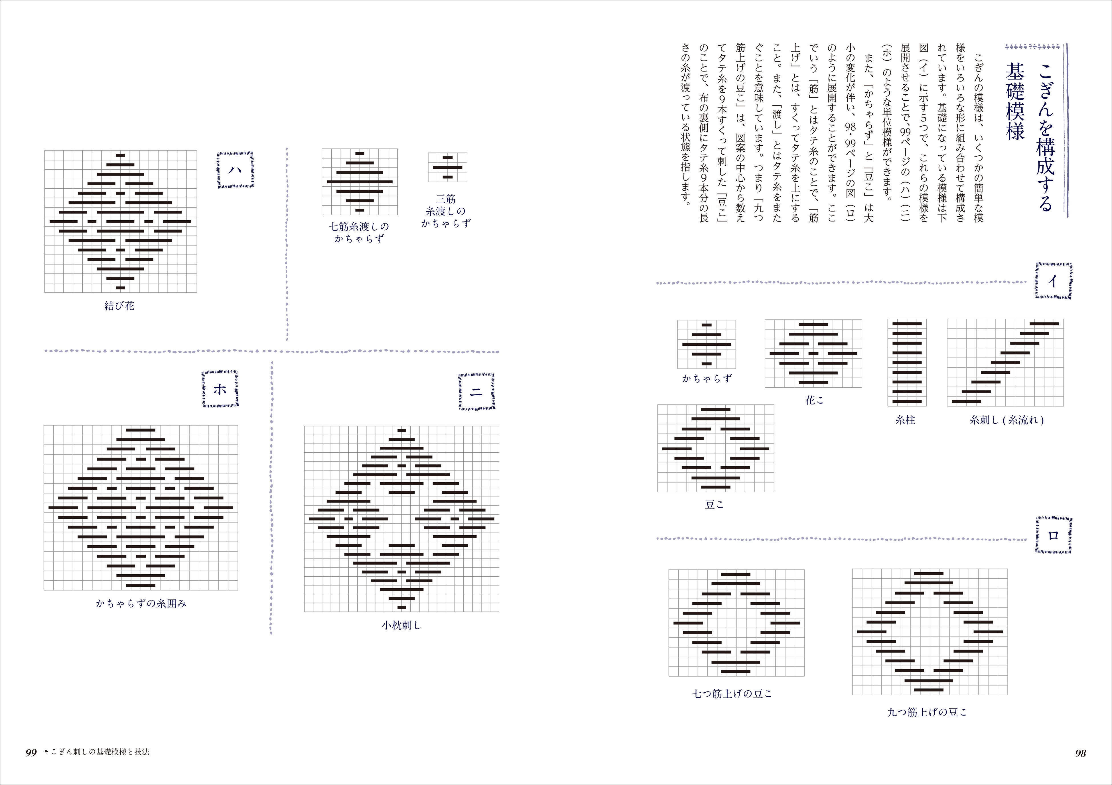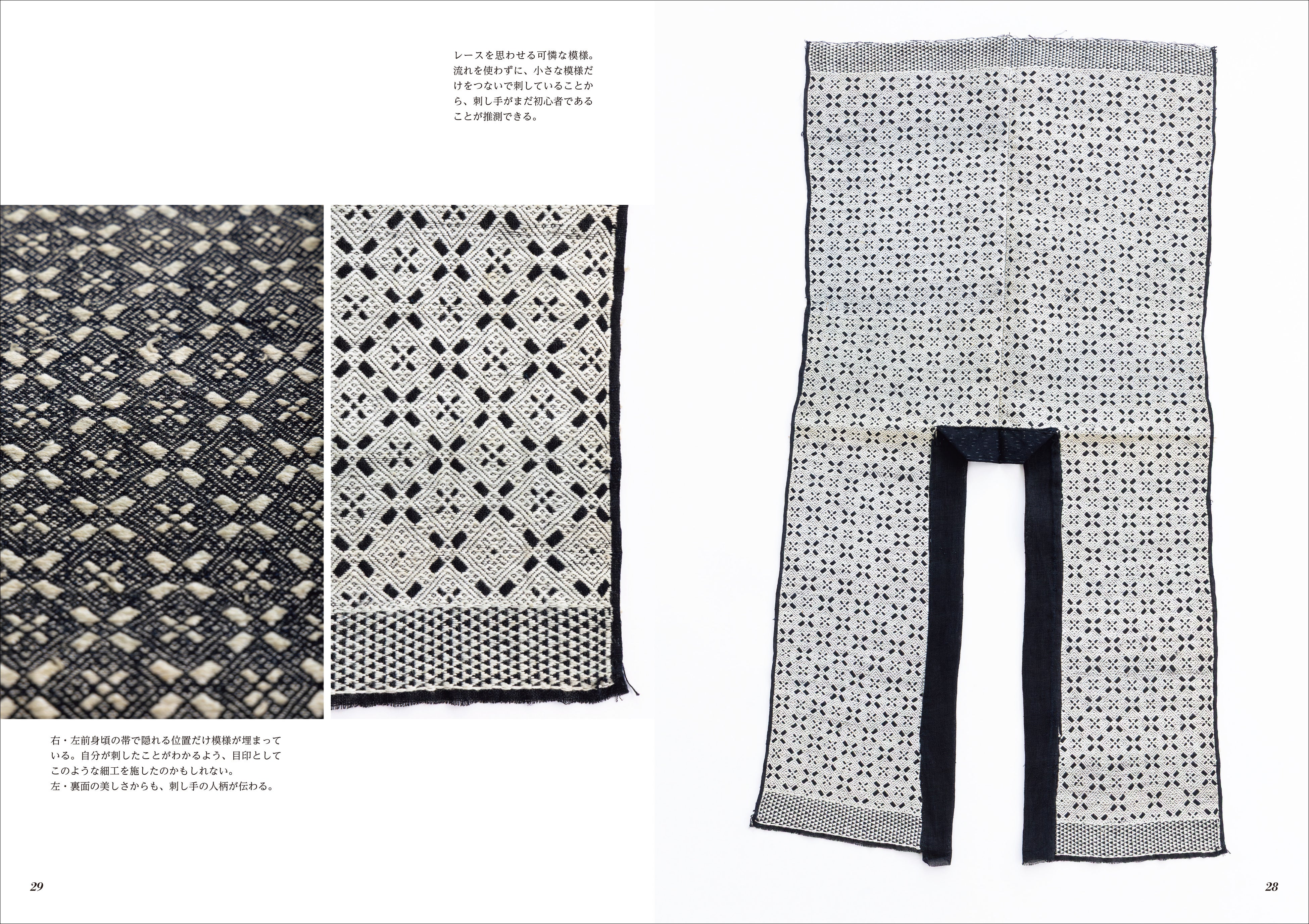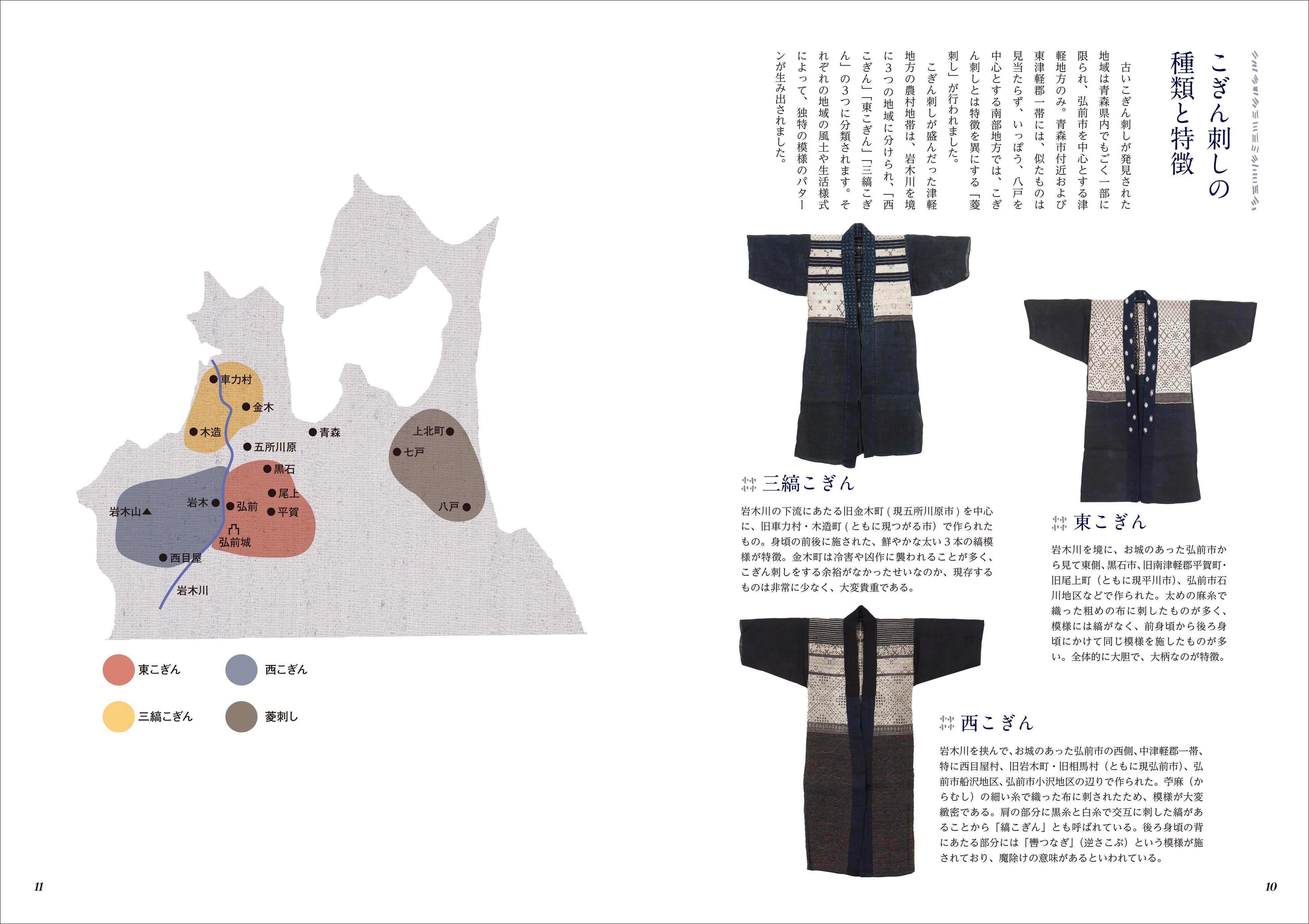 民藝運動との関わりや、こぎん刺しの伝統を守り伝える方々へのインタビュー、モドコの図案、南部菱刺しとの関係性についても触れ、多方面からこぎん刺しの知識を深められる構成に。