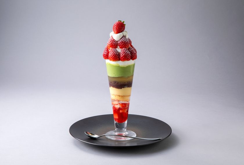 抹茶パフェに自社農園で採れる完熟いちごをたっぷりトッピング!抹茶の深い香りとコクに、フレッシュでみずみずしいいちご本来の甘酸っぱさが重なり、より華やかな味わいをお楽しみいただけます。