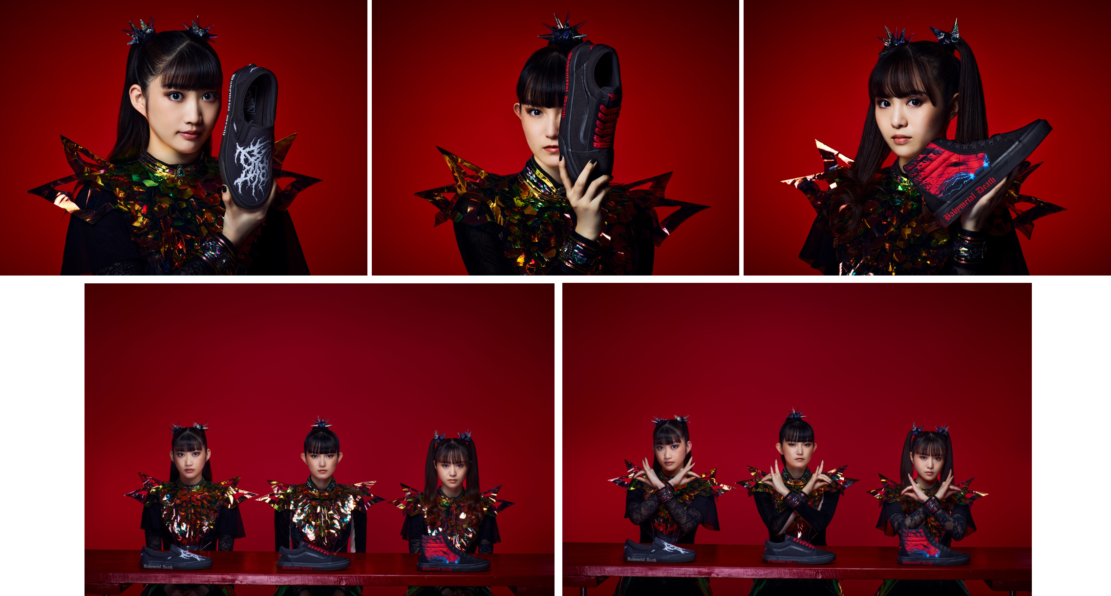 シューズは、かかと部分にBABYMETALロゴを施し、フォクシングラインに彼女たちの曲名であり、自己紹介のセリフの一部でもある“BABYMETAL DEATH”のテキストをプリントしています。