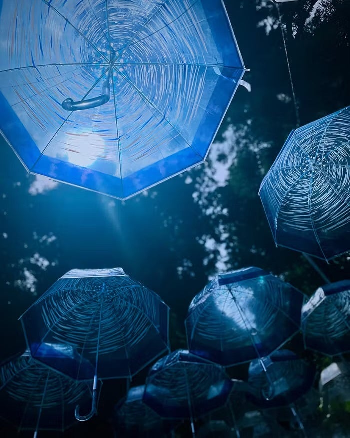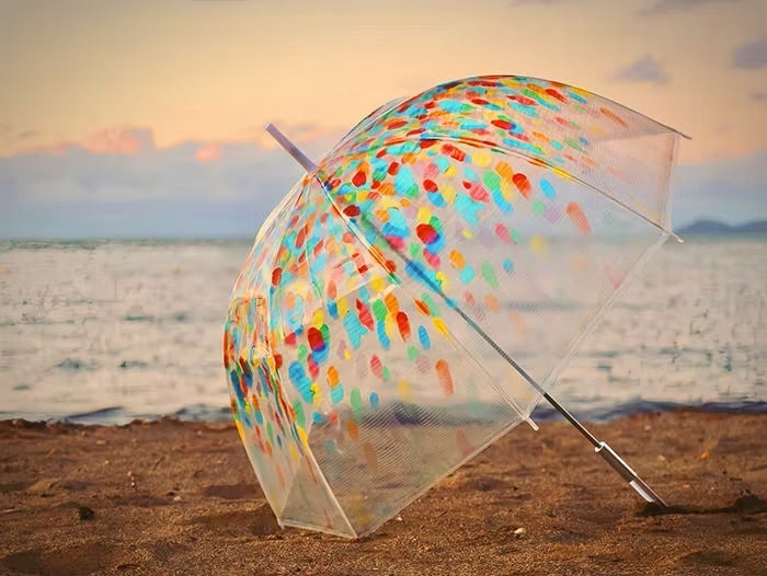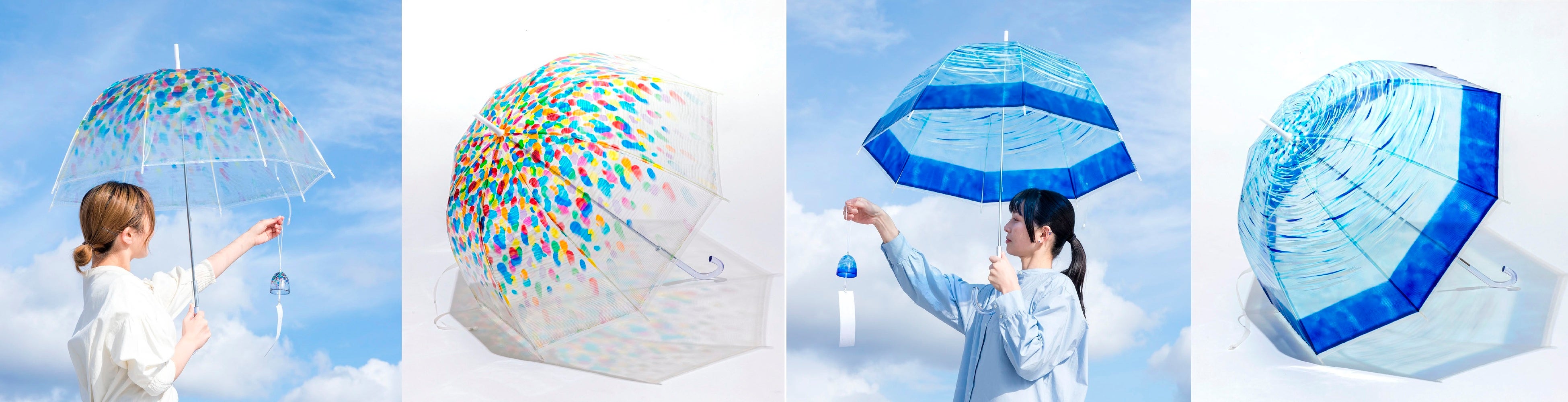 色彩と透明感が魅力の、青森の伝統工芸「津軽びいどろ」の風鈴をモチーフにした傘です。青森から全国に届けられ、多くの人に親しまれている伝統工芸「津軽びいどろ」の魅力を、2つの透明傘に表現しました。ガラスの揺らめきや風合いをイラストでていねいに再現し、傘を差して見上げると、まるで風鈴の内側に入ったかのような爽やかな世界が広がります。