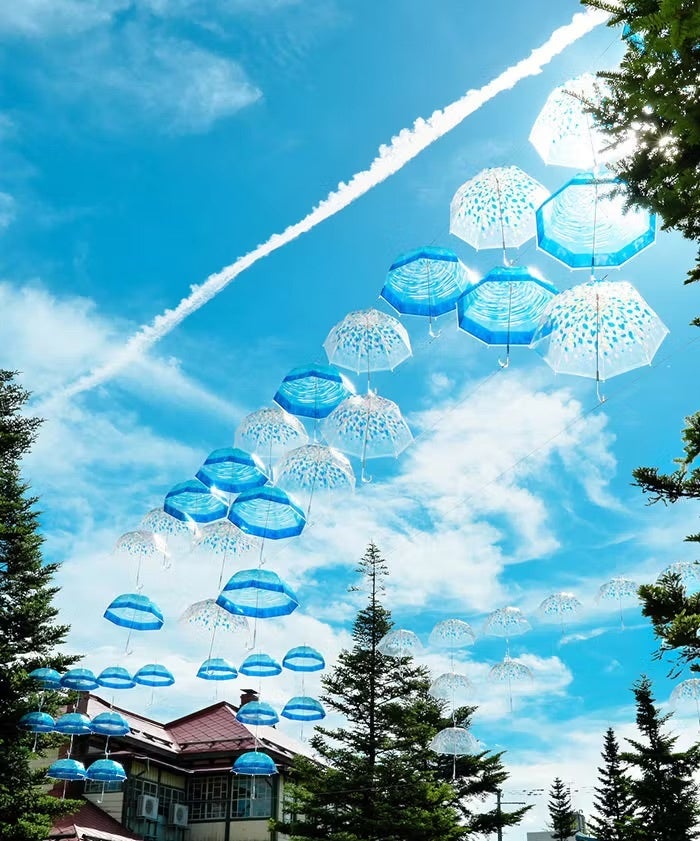 アンブレラスカイの見上げる楽しさと開放感が凝縮された、明るくダイナミックな作品です。背景の青空に遠近感ある構図で連なる津軽びいどろの風鈴傘と、一直線に伸びる飛行機雲が見事に共演しています。傘に映し取られた伝統工芸の色彩と大自然が描くアートが融合した感性豊かで絶妙な一枚です。
