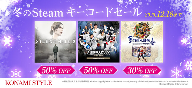 株式会社コナミデジタルエンタテインメント(以下、KONAMI)は、KONAMIの公式通販サイト「KONAMI STYLE」で、Steam版のゲームを最大80%OFFでお得に購入できる「KONAMI STYLE 冬のSteamキーコードセール」を本日12月10日(水)から12月18日(木)まで開催します。