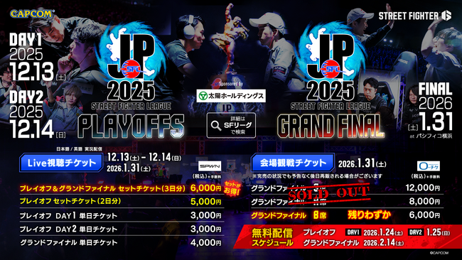 「ストリートファイターリーグ: Pro-JP 2025 グランドファイナル」は1月31日(土)パシフィコ横浜で開催! 会場観戦チケットは売り切れ間近! LIVE視聴チケットは「SPWN」にて販売中!