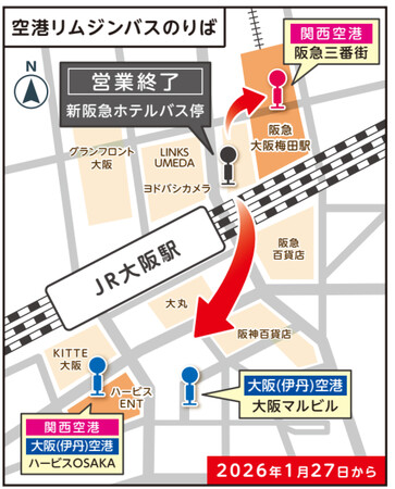 阪急観光バス株式会社(本社:大阪府豊中市 代表取締役社長:寺西 保)と阪神バス株式会社(本社:兵庫県尼崎市、代表取締役社長:城島 和弘)、関西空港交通株式会社(本社:大阪府泉佐野市、代表取締役社長:河合 潤二)は、2025年12月より実施される旧大阪新阪急ホテル建物の解体に伴い、2026年1月27日(火)に「大阪駅前(新阪急ホテル)」バス停の営業を終了し、空港リムジンバス関西国際空港線・大阪(伊丹)空港線の大阪駅前エリアのバス停再編・ダイヤ改正を実施します。(認可申請中)