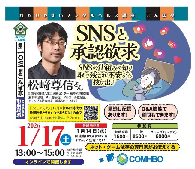 【NPO法人地域精神保健福祉機構・コンボ主催】第103回こんぼ亭月例会『SNSと承認欲求~SNSの仕組みを知り取り残され不安から抜け出す~』(2026/01/17; オンライン開催)