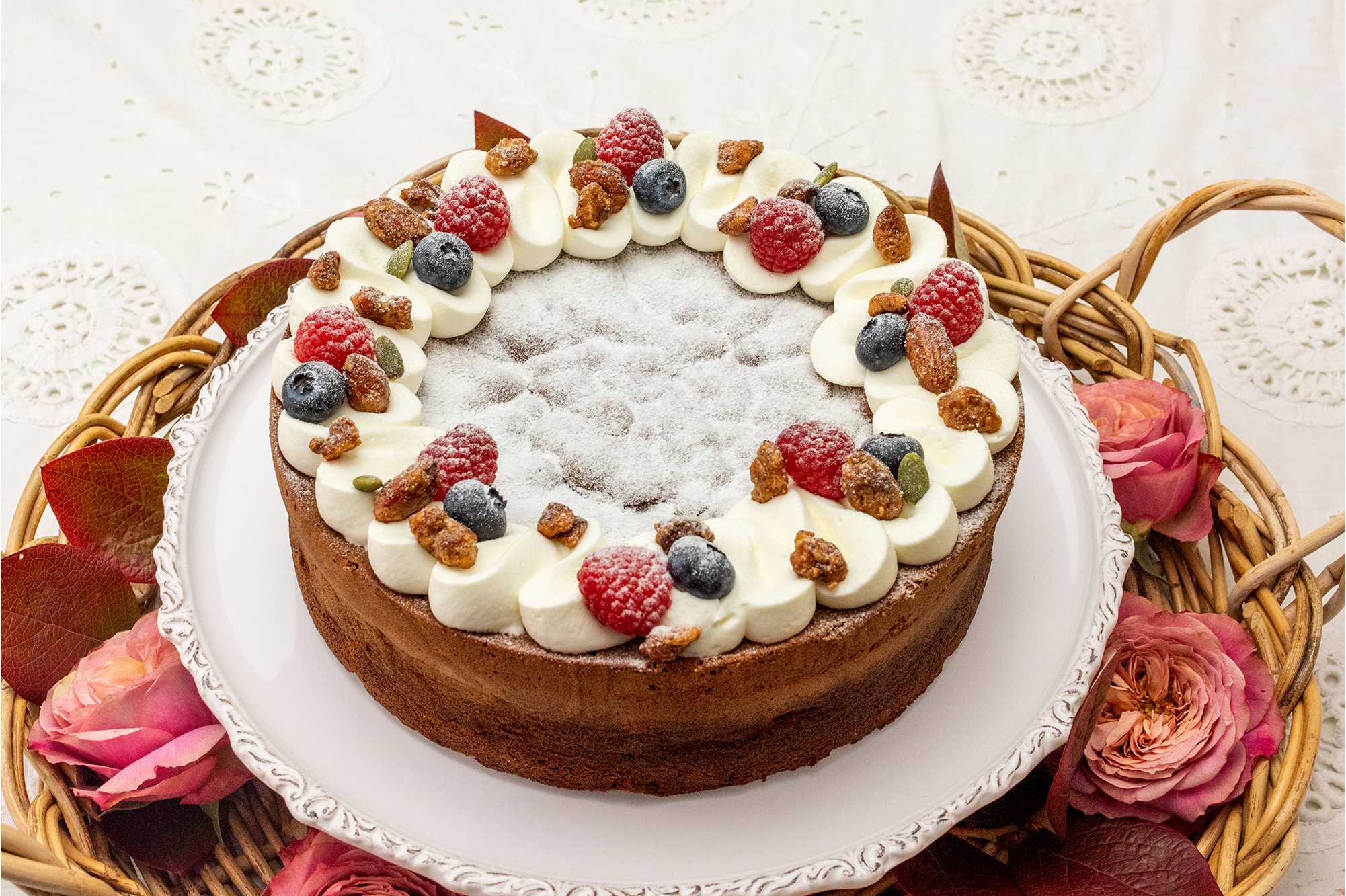 しっとりとした味わいのチョコレートケーキにフリルのクリームを飾った、クリスマスにぴったりのケーキです。甘酸っぱいフルーツとナッツが相性抜群です。