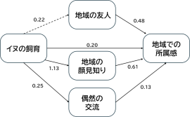 (※添付ファイル:「図 イヌの飼育が地域の顔見知りと関連し、また地域における偶然の交流を高め、その結果、地域での所属感につながる関連性が見いだせた」参照)