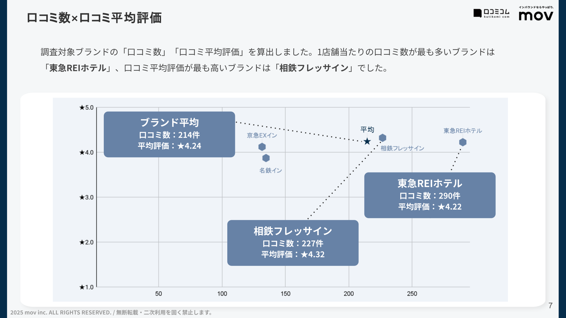 調査対象ブランドの「口コミ数」「口コミ平均評価」を算出しました。1店舗当たりの口コミ平均評価が最も高いブランドは「相鉄フレッサイン」でした。