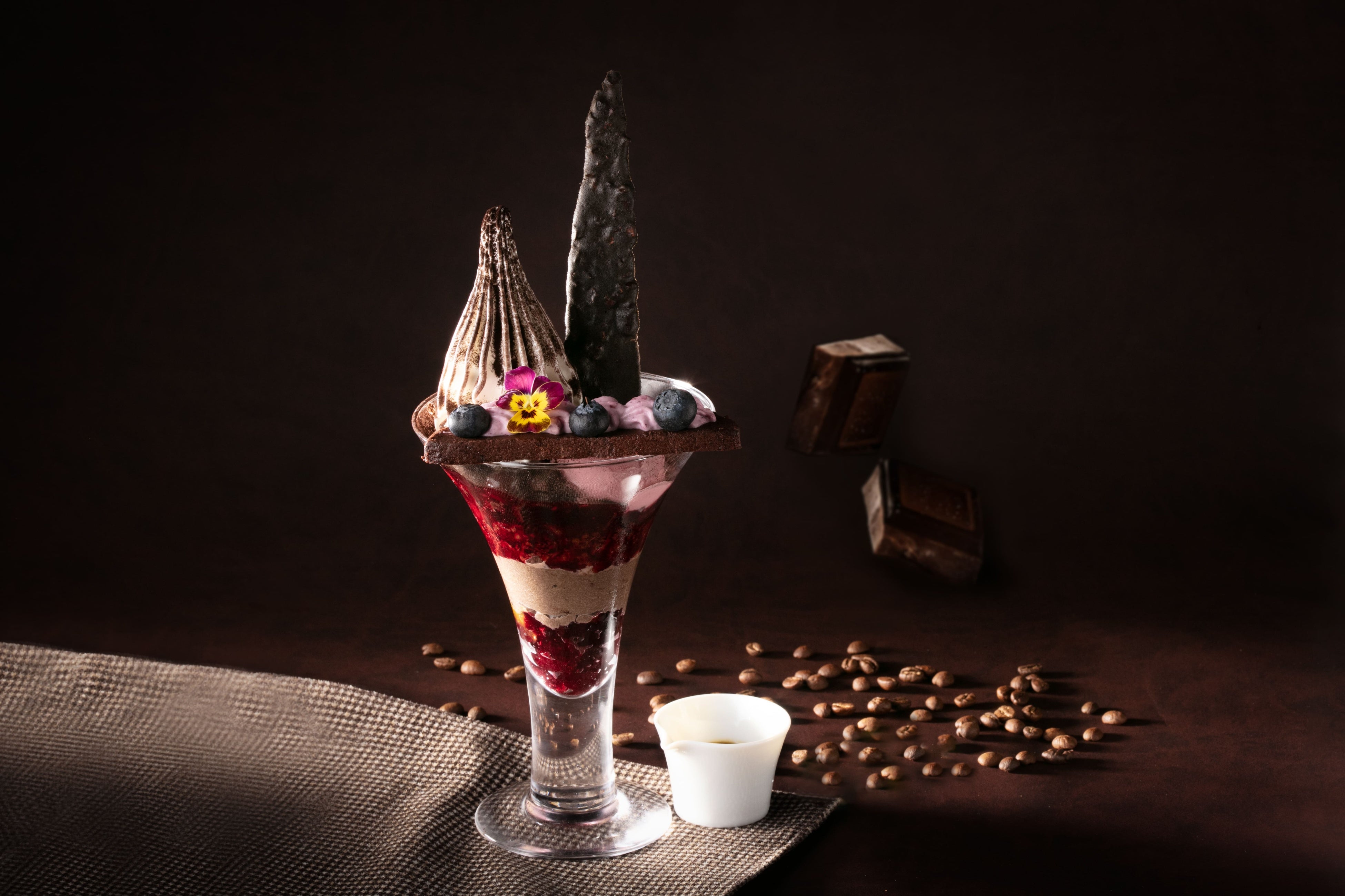 パフェの上部には、ブラックココアパウダーを纏ったクレミアソフトクリームと、ベリークリームをあしらったチョコレートテリーヌを添えました。さらに、黒胡麻入りの特製カカオニブチュイールを上部に飾り付け、見た目にもインパクトを与えつつ、黒胡麻の香ばしさとほのかな苦みで、味わいにも奥行きをもたらします。また、ほんのりと温かい別添えのエスプレッソソースを注げば、ほろ苦い大人のアフォガード風味も楽しめます。