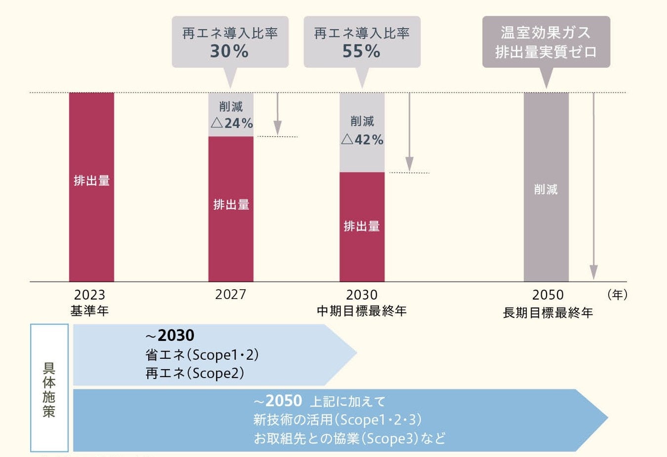 Scope1+2の削減策として、2024年度より段階的に再生可能エネルギー導入店舗の拡大に努めております。岩田屋本店の本館・新館では2024年期中、三越日本橋本店の本館では2025年度4月より、実質的に再生可能エネルギー100%で運営しています。再エネ調達にあたっては、電源の追加性も重視し、三越日本橋本店の本館ではオフサイトコーポレートPPA(Power Purchase Agreement)モデルを活用した太陽光発電由来の電力と、実質再エネ由来の電力を組み合わせています。