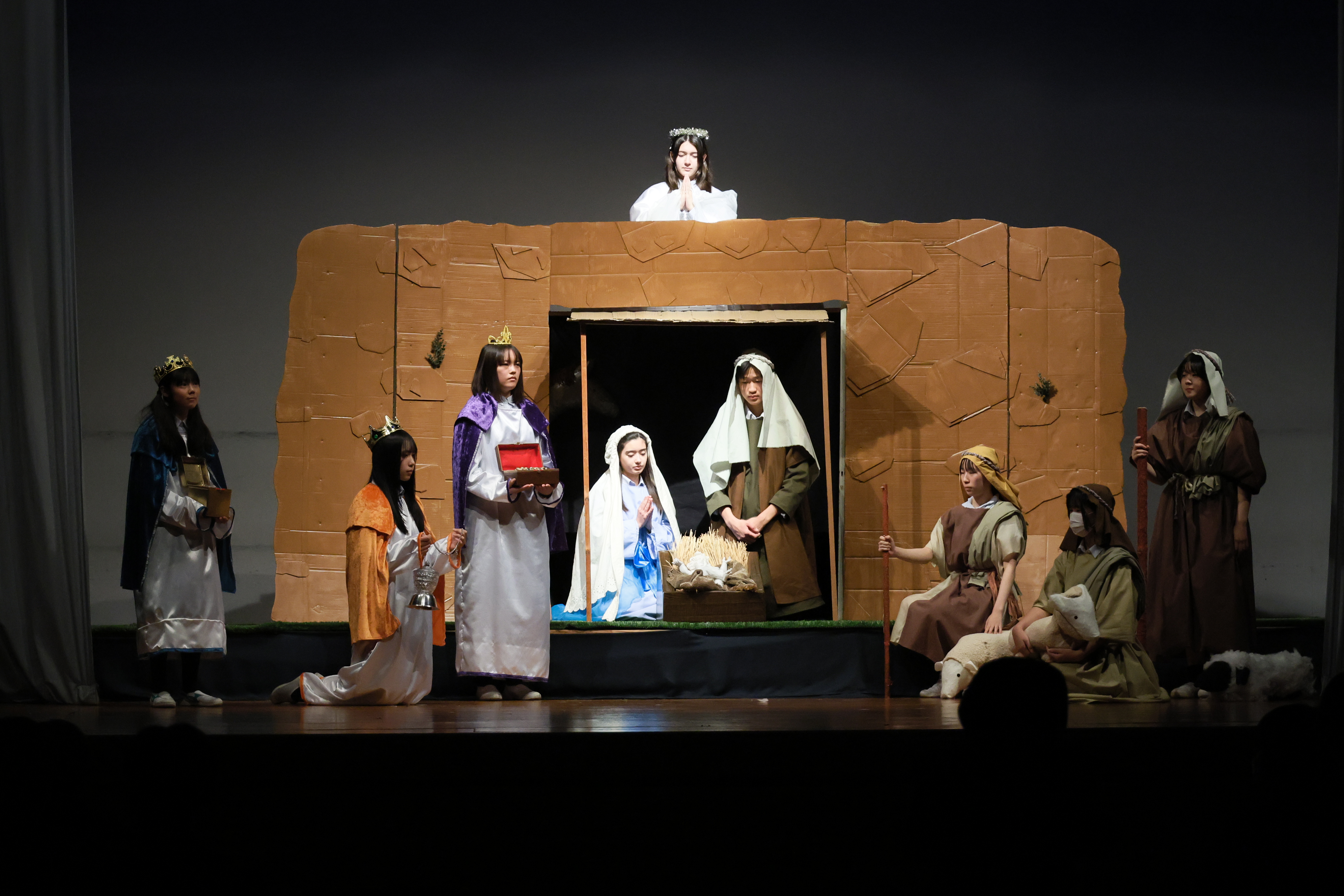 内容:生徒たちが、イエス・キリストの降誕を表現するタブロー(演技者が静止し、絵画のように一場面を作り出す演劇の手法)を披露します。中学生高校生による朗読や歌唱、演奏も見どころの一つです。後半はクリスマスミサを実施します。