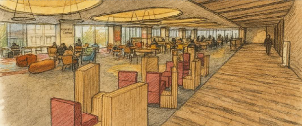 研究実験棟Ⅳ 1階の学生ホールに、コメダ珈琲店で使用されるソファと谷田研究室が考案したスリット家具を組み合わせた「次世代のくつろぎ空間」のイメージ