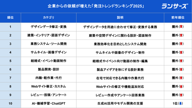 その一方で、2023~2024年と2年連続でランクインしていた「文字起こし」はランク圏外となり、生成AIの普及により、単純作業の依頼ニーズが減少していることが示されています。