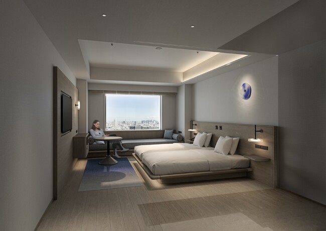 客室は、都会的で洗練されたシンプルなデザインとし、荷物の多いインバウンドのお客さまに不可欠なゆとりのあるスペースを確保するため、置き型の家具を最小限に留める一方で、自慢の眺望を最大限お楽しみいただくためのソファの配置等にこだわります。バスルームも一新し、トイレ・洗面を独立させることで、複数名利用時の利便性を向上させます。窓は遮熱・断熱性能を強化するほか、天井には空気清浄機を組み込むなど、さまざまな面から快適性を高めます。また、どなたでも安全・安心に滞在できる環境を整えるため、段差の少ないアクセシブルルームを4室新設します。