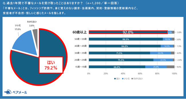 - ユーザの約8割(79.2%)が「過去1年間で不審なメールを受け取ったことがある」と回答。