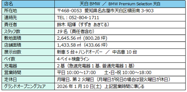 株式会社ヤナセ(社長:森田 考則)のグループ会社で、BMWを専門に取り扱う、ヤナセ バイエルン モーターズ株式会社(社長:落合 貴 本社:東京都港区)は「天白BMW/BMW Premium Selection天白」をリニューアルし、12月17日(水)に営業を開始します。
