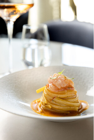 仕上げにのせる函館産の甘エビは、余熱でやさしく温まり、甘みととろけるような食感を引き出します。海のエッセンスをそのまま纏うような一皿です。