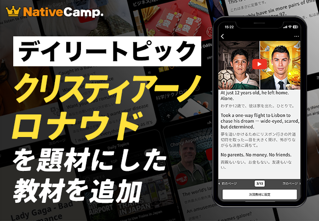 ネイティブスピーカーと回数無制限のオンライン英会話サービス「ネイティブキャンプ英会話」を展開する株式会社ネイティブキャンプ(東京都渋谷区 代表取締役:谷川国洋)は、2025年12月17日(水)、世界の様々な動画を活用した人気教材「デイリートピック」において、世界的サッカー選手「クリスティアーノ・ロナウド(Cristiano Ronaldo)」を題材とした新教材を追加しました。