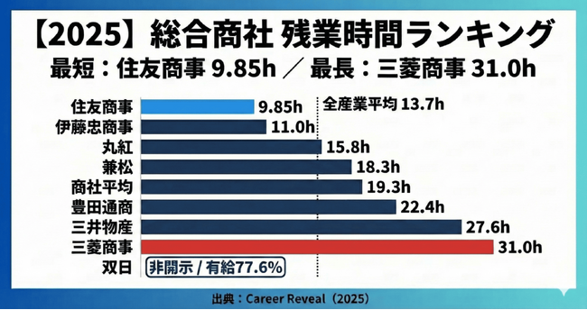 Career Revealは、総合商社各社が有価証券報告書で開示する残業時間データを分析し、2025年期の「残業時間ランキング」を公開しました。