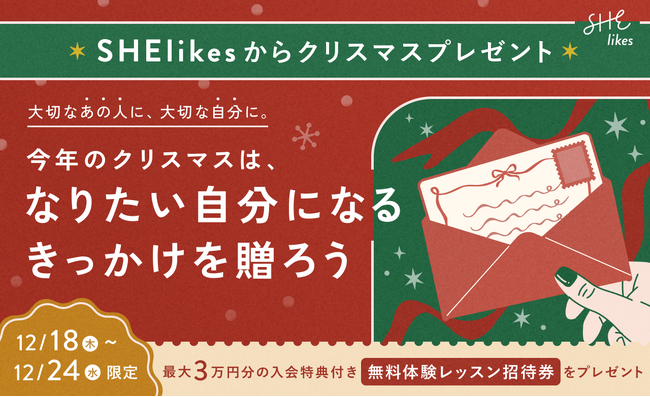 学ぶから働くまでを支援する女性向けキャリアスクール「SHElikes(シーライクス)」を運営するSHE株式会社(所在地:東京都港区、代表取締役CEO/CCO:福田恵里、以下SHE)は、2025年12月18日(木)から12月24日(水)までの期間限定で、女性向けキャリアスクール「SHElikes(シーライクス)」の無料体験レッスンを“クリスマスギフト”として贈ることができる「学びのギフト」キャンペーンを実施します。