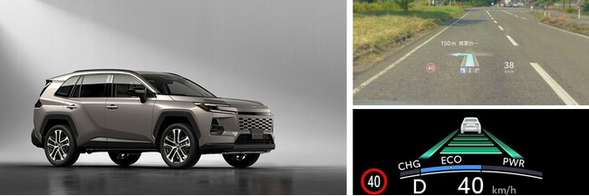 左:RAV4(プロトタイプ)/画像提供:トヨタ、右上:HUD表示イメージ、右下:HUD表示画像※車体の画像は2025年5月発表時点のものです。