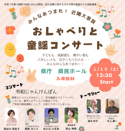 特定非営利活動法人じゃんけんぽん (所在地:群馬県高崎市、 理事長:井上謙一、 以下:認定NPO法人じゃんけんぽん)は、 『みんなあつまれ!近隣大家族 おしゃべりと童謡コンサート』 (後援:群馬県)を2026年1月10日(土)13:30~ 群馬県庁1階 県民ホール(群馬県前橋市大手町1-1)にて開催します。 入場無料。