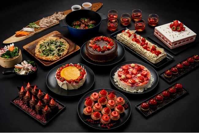 毎年人気の「苺」のスイーツビュッフェは、甘酸っぱい苺が香り立つ1月にスタートします。チョコレートを引き立てる多彩なストロベリースイーツには、ビターショコラを纏った「ザッハトルテ」や爽やかな酸味の「苺とレモンチョコのレアチーズケーキ」など、バラエティ豊かにラインナップ。出来立てを味わえるオープンキッチンでは、お好みの旬食材を選んで楽しむ人気の「せいろ蒸し」に加え、寒い季節にぴったりな3種の「あったか小鍋」もご用意します。温かな料理とともに、苺の軽やかな酸味とチョコレートの深い香りが重なり合う、“Sweet Harmony”の世界をお楽しみください。
