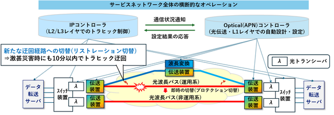 大学共同利用機関法人 情報・システム研究機構 国立情報学研究所(本所:東京都千代田区、所長:黒橋 禎夫、以下「NII」)、NTT株式会社(本社:東京都千代田区、代表取締役社長:島田 明、以下「NTT」)、NTT東日本株式会社(本社:東京都新宿区、代表取締役社長:澁谷 直樹、以下「NTT東日本」)は、激甚災害時のネットワーク維持を想定し、通信状況に応じて光伝送レイヤの設計・制御を自動化することで、波長変換を含む光波長パスにおける経路切替やオンデマンド追加設定を短時間で実現する技術の実証に、世界で初めて成功しました。本成果により、迅速な光波長パスの経路切替・追加提供が可能となり、先端技術研究を支える高信頼な通信基盤の実現と、その利便性の向上が期待されます。