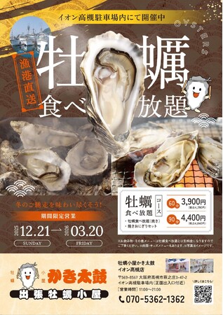 全国各地から産地直送された新鮮な牡蠣を心ゆくまで堪能できる「牡蠣小屋 かき太鼓」が2025年12月21日(日)イオン高槻駐車場内に冬季限定でNEW OPEN!