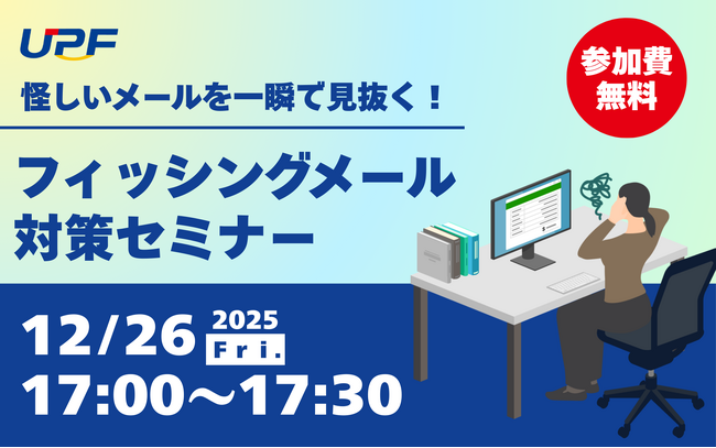 リスクマネジメント分野のコンサルティングサービスを提供する株式会社UPF(本社:東京都中央区、代表取締役:仲手川 啓、以下当社)は、2025年12月26日(金)17:00より、フィッシングメールの見抜き方と対策をテーマとした無料オンラインセミナーを開催いたします。