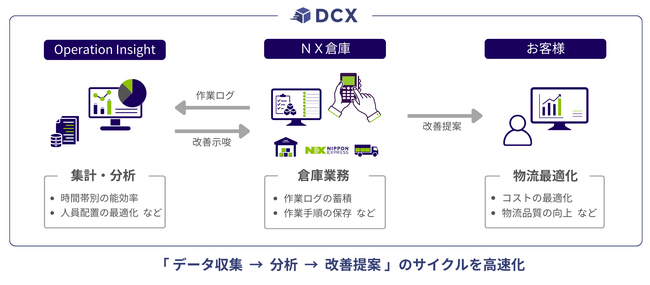 本サービスは、DCXを利用したNXグループ内の倉庫管理業務において、日々のオペレーションで蓄積された詳細な作業データを自動的に集計・分析し、現場改善やお客様への提案に活用できる仕組みです。