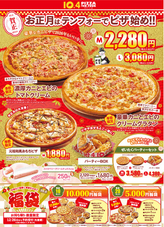北海道生まれの宅配ピザチェーン10.4(テンフォー) を運営する、株式会社テンフォー(本社・北海道函館市/代表・高橋仁志) は、毎年大好評でお得感たっぷりの『ピザ福袋』を2026年1月1日(祝・木) より各店舗数量限定で発売いたします。次回使えるピザ無料券などが入った新年にぴったりの嬉しい福袋です。
