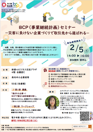 埼玉県では、県内中小企業のBCP(事業継続計画)策定を支援するため、三井住友海上火災保険株式会社との包括的連携協定に基づき、BCPセミナーを開催します。