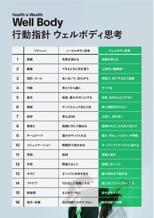 ウェルボディ思考の特徴は、16の行動をノーマルボディ思考(一般的な思考)とウェルボディ思考(Well Bodyが目指す思考)に分類し、比較形式で提示している点です。