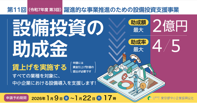 公益財団法人 東京都中小企業振興公社(本社:東京都千代田区、理事長:中西 充)では、都内中小企業の中長期的な成長を支え、東京の産業力の強化及び都内経済の持続的発展につなげていくことを目的として「躍進的な事業推進のための設備投資支援事業」を実施しています。