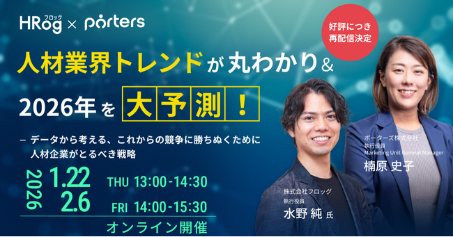 人材ビジネス向けマッチングシステムを提供するポーターズ株式会社(東京証券取引所グロース.証券コード5126、東京都港区、代表 西森 康二)は、株式会社フロッグ(以下、フロッグ)と共同で開催した「人材業界トレンドが丸わかり&2026年を大予測! ~データから考える、これからの競争に勝ちぬくために人材企業がとるべき戦略~」の再配信を2026年1月22日(木)13:00~と2月6日(金)14:00~に行います。