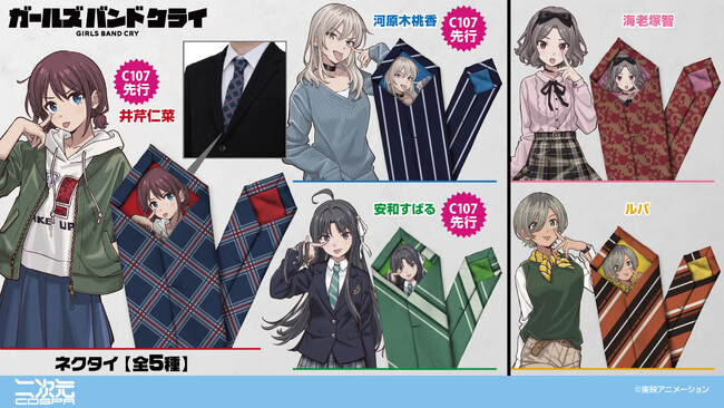 アニメ『ガールズバンドクライ』より、仁菜たちそれぞれの「ネクタイ」をはじめ、トゲナシトゲアリ5人の「オールプリントTシャツ」、アー写をイメージしたトゲトゲメンバーたちの「120cmビッグタオル アー写Ver.」が二次元コスパから登場です。