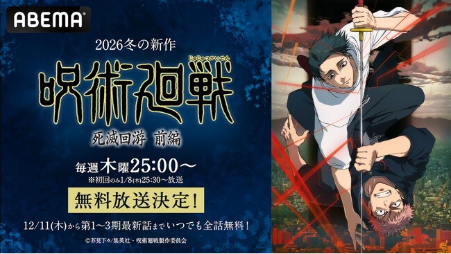 大人気アニメ『呪術廻戦』第3期「死滅回游 前編」、「ABEMA」で2026年1月8日(木)夜25時30分より無料放送決定!12月11日(木)からは新映像含むTVアニメシリーズの全話無料配信も