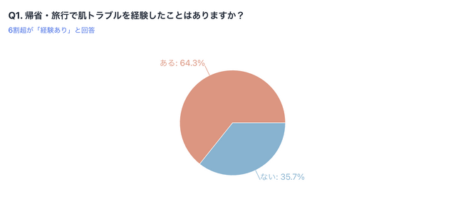 その結果、64.3%の方が「経験がある」と回答し、移動や環境変化が肌に影響を与えている実態が明らかになりました。