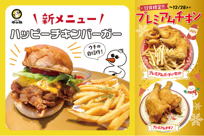 あわせて、クリスマスシーズンにぴったりな期間限定商品として、12月限定の「プレミアムチキン」も登場。1本から気軽に楽しめるほか、フライドポテトやオニオンリングを盛り合わせた「プレミアムパーティーセット」もご用意しています。ご家族やご友人との集まり、年末のパーティーシーンにも最適!テイクアウトはもちろん、店内でもご注文いただけます。現在、店舗近隣ではサーカスの公演も行われておりますので、観覧後はぜひ「鶏肉と卵 幸の鳥」にお立ち寄りください!