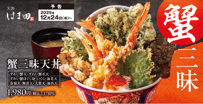 アークランドサービスホールディングス株式会社の子会社、とんかつ専門店「かつや」を展開している株式会社かつや(本社:東京都千代田区/代表:大内 勇一)は、2025年12月24日(水)より国内「天丼はま田」1店舗および「天ぷらめしはま田」3店舗にて、期間限定メニュー「蟹三昧天丼」を販売開始いたします。
