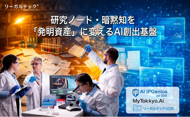 リーガルテック株式会社(東京都港区:代表取締役社長 平井 智之)は、企業内に蓄積されながら活用されていない研究ノート、実験記録、技術メモなどの“暗黙知”を発明として構造化し、無形資産化を支援するAI創出基盤を発表した。本基盤は、発明創出プラットフォーム「IPGenius」、特許分析基盤「MyTokkyo.Ai」、技術文書共有基盤「リーガルテックVDR」を統合することで、技術情報の「発見 → 発明化 → 共有」プロセスを一貫して支援するものである。