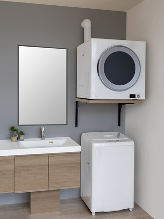 狭い洗濯脱衣室空間において、洗濯機上に乾太くんを設置することが可能となり、動線を少なくすることで時短と効率化を実現いたします。※「乾太くん」は東京ガス株式会社の商標登録です。