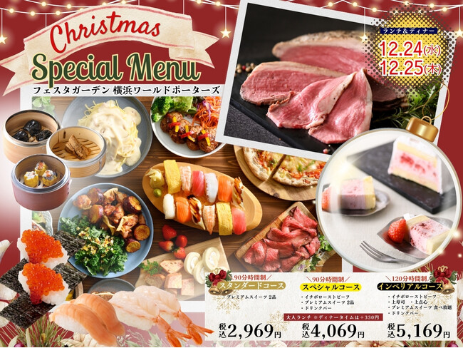 【 クリスマスは特別メニューで心躍る食べ放題を♪】みなとみらいの夜景とともに食べ放題が楽しめる『フェスタガーデン』では12/24・12/25限定にてクリスマス特別メニューをご提供いたします!