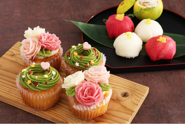 あんこでカップケーキを可愛く飾りつけます。白あんのほかに、ビーツパウダーを入れたあんを花形に絞ると、華やかな見た目に大変身。また抹茶を入れたあんでは、クリスマスリースを作りました。