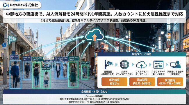 DataHax株式会社(本社:東京都新宿区)は、中部地方の商店街にて全2か所のAI人流解析を実施しました。24時間の計測を約1年間運用し、単純な人数カウントに留まらず、年齢層・性別・衣類の種類などの属性推定も行いました。機材の設置から保守運用、解析までDataHaxが担当し、解析結果はクラウドへリアルタイムアップロードする運用を構築しました。