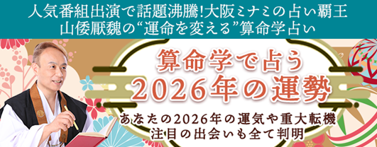 大阪ミナミの占い覇王として数々の番組やメディアで人気を博している山倭厭魏(やまとおうぎ)による本格算命学サイト『山倭厭魏の算命学』にて、この度算命学で占う『2026年の運勢占い』を無料公開いたしました。生年月日を入力するだけで、2026年にあなたに訪れる運勢や今後の転機、未来の重要な出来事、仕事運、恋愛運などを占うことができます。