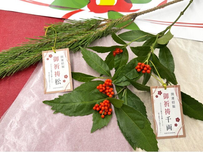 「御祈祷松」および「御祈祷千両」は、いずれも開運招福を願う清めのタグを添え、首都圏を中心とした日比谷花壇の店頭にて数量限定で取り扱います。