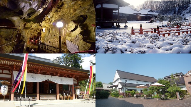 左上:幽玄洞(イメージ) 写真提供:一関市公式観光サイト「いち旅!」 右上:えさし藤原の郷・伽羅御所(イメージ) 左下:毛越寺(イメージ) 右下:世嬉の一酒造・外観 写真提供:世嬉の一酒造(株)