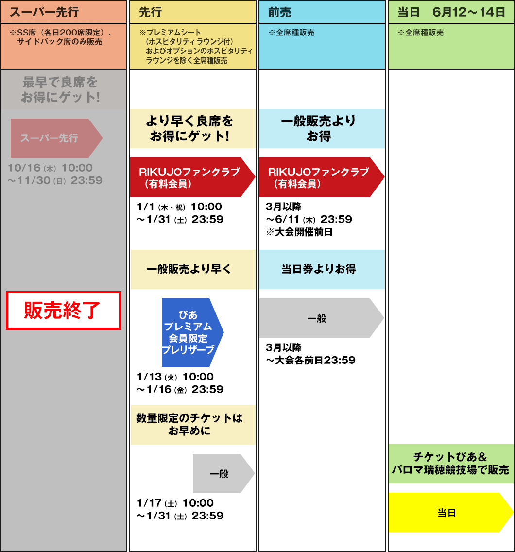 ・現時点では競技時間が未定ですので、恐れ入りますがご了承の上でお申し込みください。ご来場時間に制限のある方は競技時間が決定した後に受付をする別の販売をご利用ください。・SS席は指定席となり、良席から順に割り当ていたします(座席の選択はできません)。